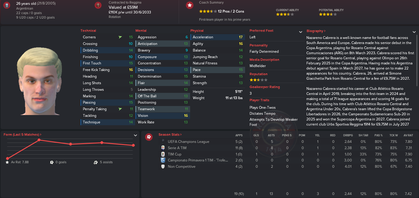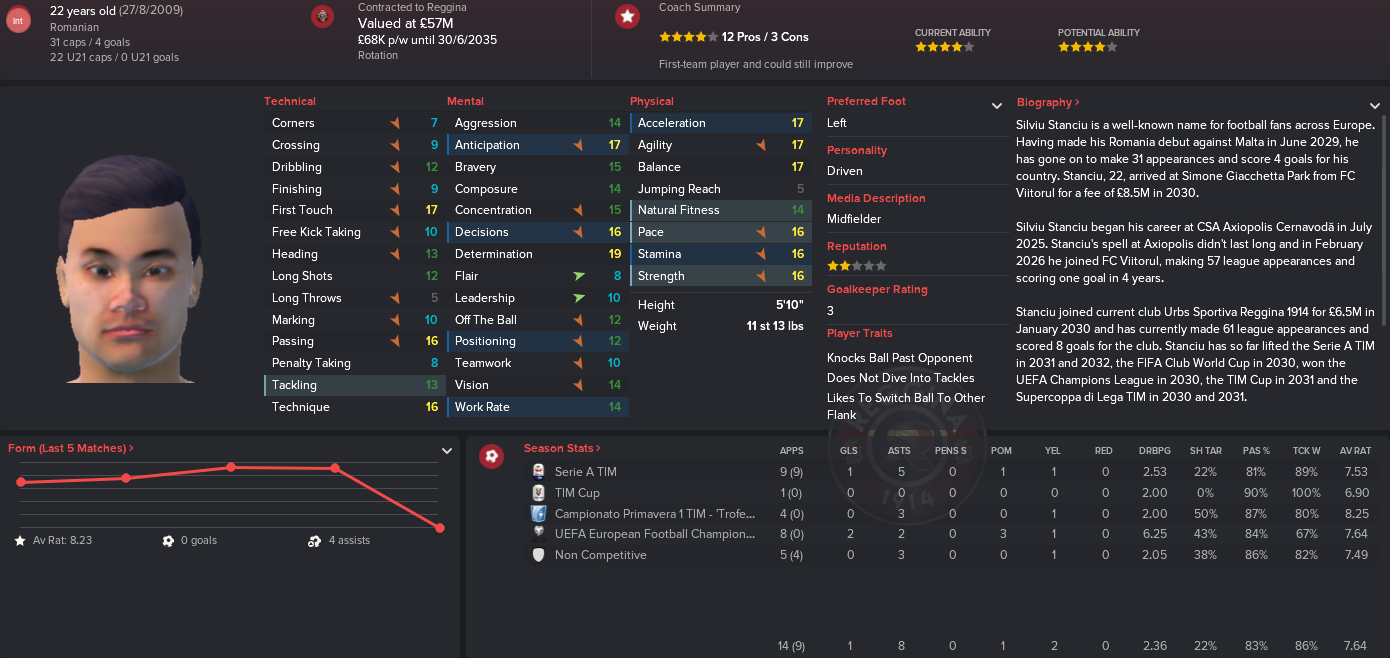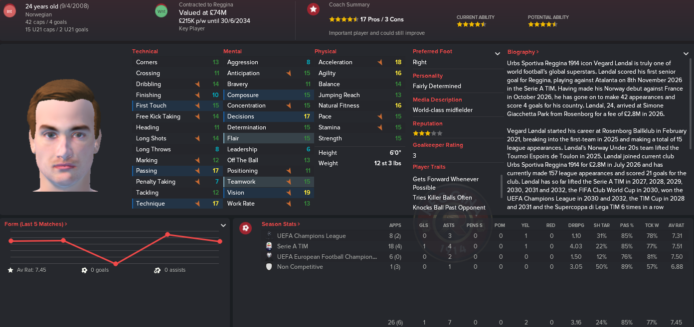 Contrastingly, the left-hand side of the pairing is not locked in terms of player role. Vegard Løndal, a Norwegian master player-maker, slots into the team as an advanced playmaker on support to provide a more advanced creative role, to dribble at opponents exploiting his pace and acceleration to panic them and then look to exploit the gaps that are opened up with a well-judged pass to a teammate. Signed for a meagre £2.8m from Rosenborg, the world-class midfielder has remained with Reggina ever since – his player pathway left open for him to come through after his predecessors were sold on. With every key attribute for the advanced playmaker position being above 15, Løndal is almost peerless in world football.