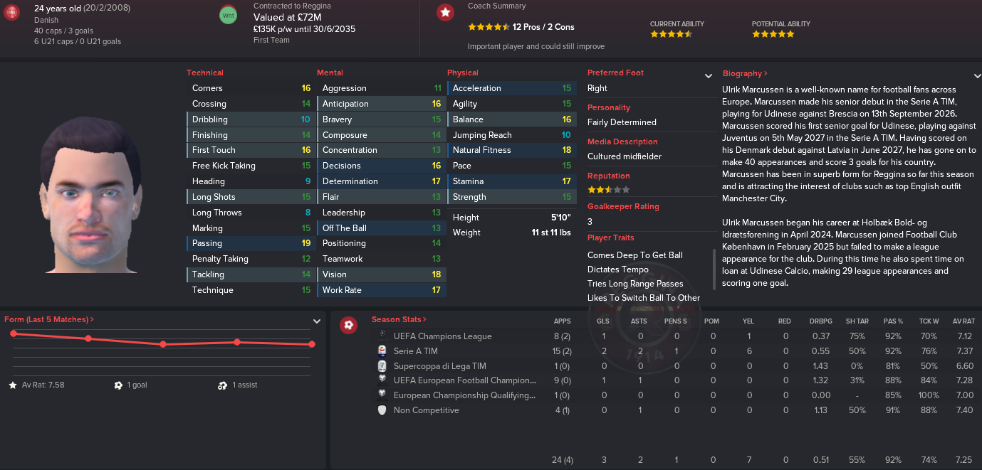 Ulrik Marcussen is a Danish maestro, signed from FC København. He was loaned out to develop whilst other central midfielders impeded his player development path at Reggina. After heading out on loans at Udinese and Burnley designed to provide him with first team action, the latter loan was cut short after an injury to a senior player at Reggina. Marcussen found his chance and he hasn’t looked back since. Subject to a recent £140m bid from Man City, a would-be world record fee, Marcussen is a truly all-round gifted player.